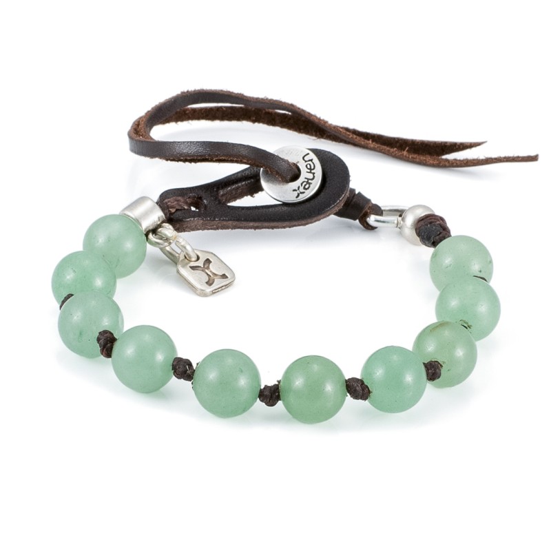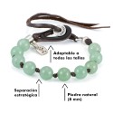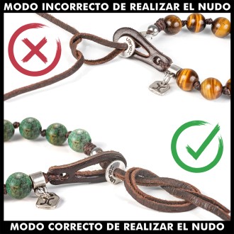 Nuestras pulseras de piedras semipreciosas, a diferencia de las que se encuentran en el mercado, llevan un ojal de cuero, que además de ser una característica original que nos identifica, permite poner y quitar la pulsera con facilidad. Esta pulsera está diseñada para que se adapte a todas las tallas, ya que, una vez ajustado el botón a la medida deseada se fija con un nudo de cuero.