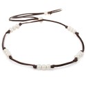 Una tira de cuero de alta calidad curtido al vegetal engarza perlas de rio agrupadas de a tres y rematadas con nudos.