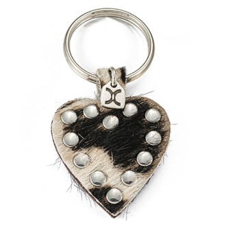 Handmade leather keychain with hair, cow-like print, high quality and embellished with rivets.